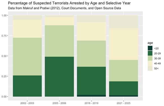 In fact, when examined in percentage terms, data suggests that youth involvement in terrorist activities has remained proportionally consistent between the early 2000s and the 2020s, despite some fluctuations in the mid-2000s and late 2010s. For instance, Makruf and Pratiwi’s data showed that, between 2002 and 2003, youths made up 25.2 percent of all terrorism-related arrests (see Graph 2).[36] Although this proportion rose to 47.9 percent between 2005 and 2006 and 40.2 percent between 2018 and 2019, it declined again in the 2020s, with youths only accounting for 23.1 percent of all recorded terrorism-related arrests between 2021 and 2025.[37] Overall, these findings suggest that while the number of youths participating in terrorist activities has increased in the 2020s, this may simply reflect the overall increase in the number of terrorist arrests during the period compared to the early 2000s.