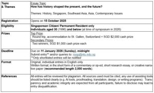 This competition presents a unique opportunity – the writer of the winning entry* will supported by RSIS to join Singapore’s delegation to the 55th St. Gallen Symposium, “The Disrupted Age,” to be held 6 – 7 May 2026 in Switzerland. The Symposium is recognised as one of the world’s foremost platforms for inter-generational dialogue, bringing together global leaders, scholars, youths of influence, and emerging voices to exchange ideas on critical issues shaping our future. The winner will have opportunities to connect with distinguished leaders from government and industry, as well as other changemakers shaping our future. All travel expenses will be borne by RSIS.
