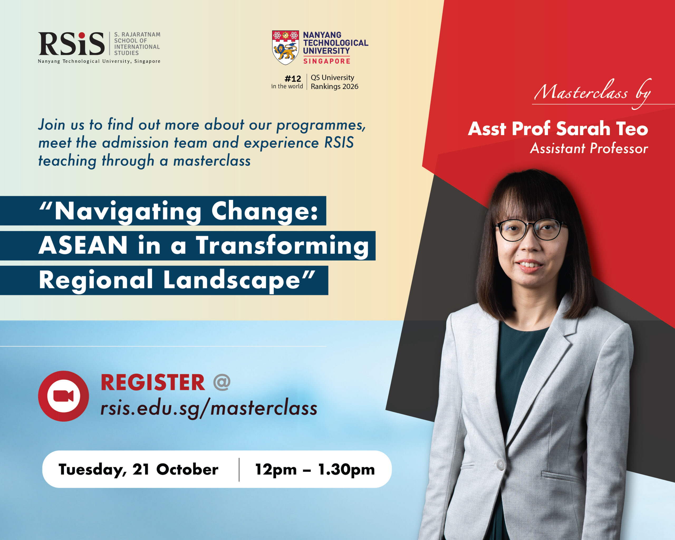 Join us to find out more about our programmes, meet the Admissions team and experience RSIS teaching through a masterclass titled “Navigating Change: ASEAN in a Transforming Regional Landscape” by Asst Prof Sarah Teo.