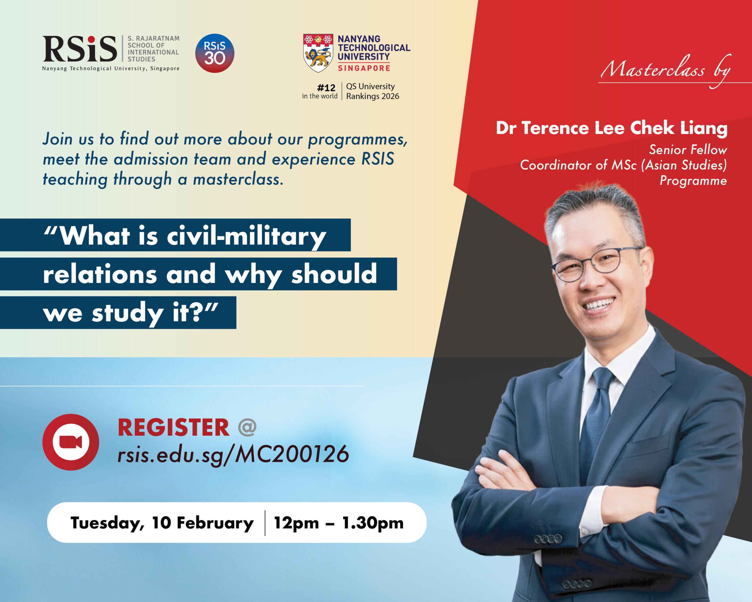 Join us to find out more about our programmes, meet the Admissions team and experience RSIS teaching through a masterclass titled “What is civil-military relations and why should we study it?” by Dr Terence Lee Chek Liang, Senior Fellow.