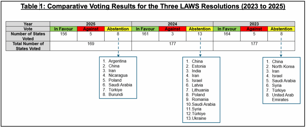 Moreover, by not calling on states to immediately begin negotiating a legally binding arms control treaty on LAWS, the resolution gained support from several states that had previously abstained from voting on the 2024 resolution, such as India, Estonia, Latvia, Lithuania and Romania (Table 1).
