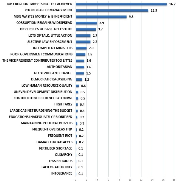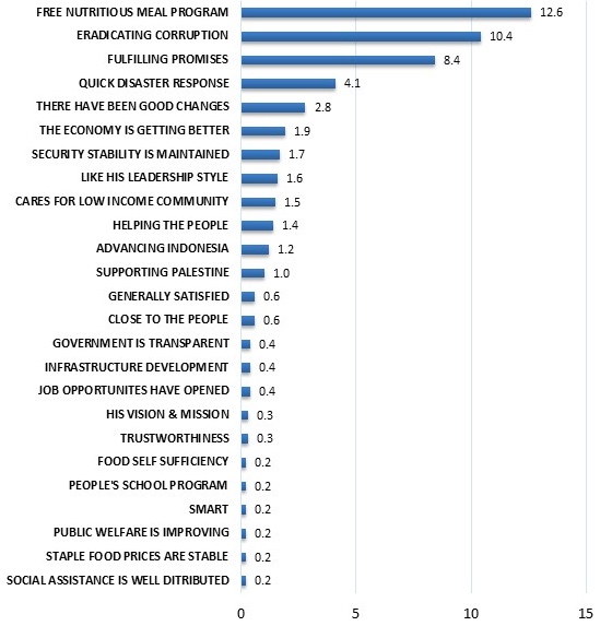 Supporters largely attribute their positive assessment to flagship welfare and governance initiatives. The Free Nutritious Meals (MBG) programme has emerged as the most frequently cited reason for satisfaction at 12.6%, followed by anti-corruption efforts at 10.4% and perceptions that campaign promises are being fulfilled at 8.4%. Meanwhile, rapid disaster response was cited by only 4.1% of satisfied respondents, indicating that although the government’s disaster management contributed to positive perceptions, it was not the primary driver of public approval (Figure 6).