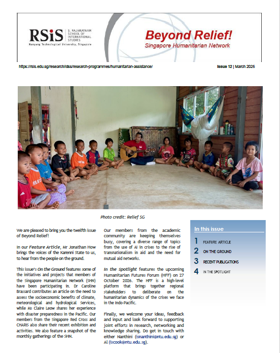 This issue’s On the Ground features some of the initiatives and projects that members of the Singapore Humanitarian Network (SHN) have been participating in. Dr Caroline Brassard contributes an article on the need to assess the socioeconomic benefits of climate, meteorological and hydrological Services, while Ms Claire Leow shares her experience with disaster preparedness in the Pacific. Our members from the Singapore Red Cross and CHARIS share their recent exhibition and activities. We also feature a snapshot of the monthly gatherings of the SHN.