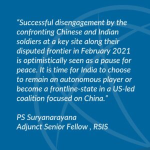 Successful disengagement by the confronting Chinese and Indian soldiers at a key site along their disputed frontier in February 2021 is optimistically seen as a pause for peace. It is time for India to choose to remain an autonomous player or become a frontline-state in a US-led coalition focused on China.