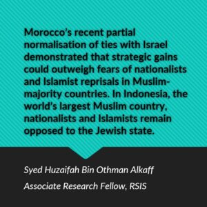 Morocco’s recent partial normalisation of ties with Israel demonstrated that strategic gains could outweigh fears of nationalists and Islamist reprisals in Muslim-majority countries. In Indonesia, the world’s largest Muslim country, nationalists and Islamists remain opposed to the Jewish state.